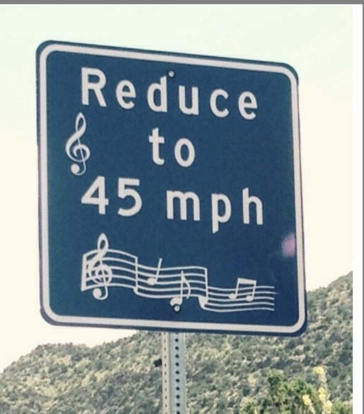We heard the groan of the rumble strip that is normally designed to alert you that you are leaving the roadway. However, it was an off and on staccato. The notches are only about the width of a tire. I would hit the strip and hear the loud noise. It was difficult to stay on the narrow corrugation. Particularly on a bend of the road and while I was simultaneously trying to monitor the speed and distance. I moved on and off the strip in a herky-jerky manner. It was as likely I would slide off the road into the ditch as ‘play’ the inspirational song.