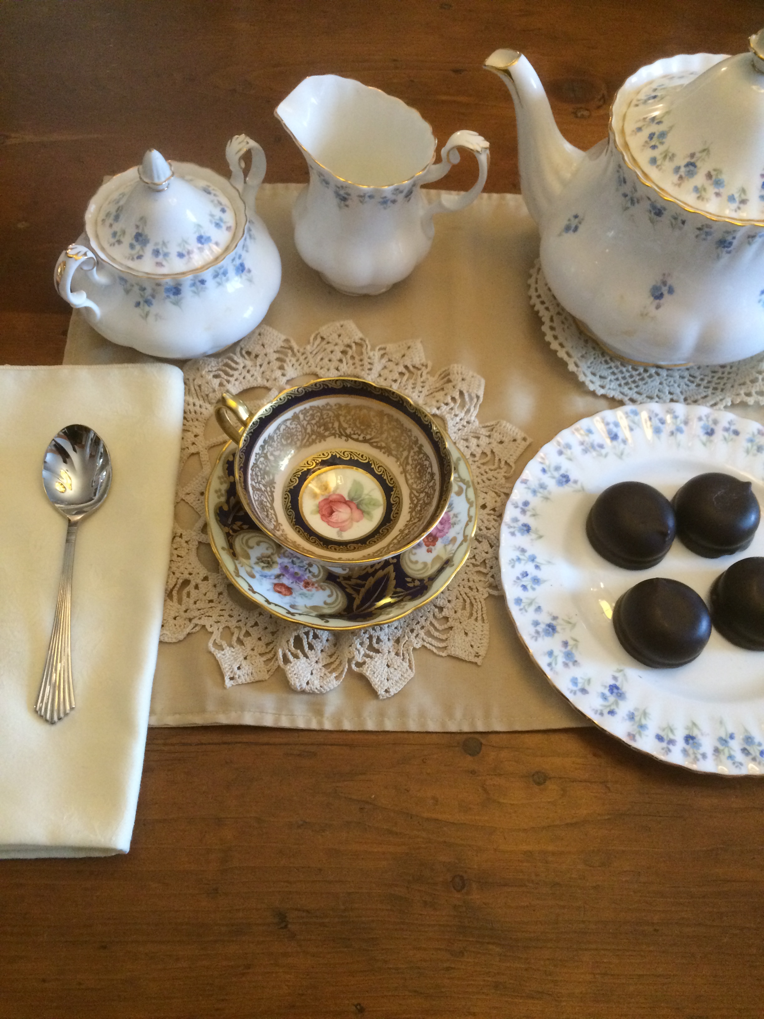“Justine, would you like some tea?” She holds a smoky pink glass out to her.